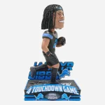 Add this Detroit Lions Foco Gibbs Most Touchdowns Bobblehead to your collection, Gibbs with blue JAHMYR GIBBS and lions logo, white 4 TOUGHDOWN GAME DETROIT LIONS, black and blue lions logos, white JANUARY 5 2025 on stand, made by Foco