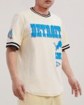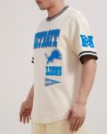 Check out this Detroit Lions Pro Standard Retro Classic Men's Tee, this will pair nicely with our other Pro Standard items, eggshell with blue patches DETROIT LIONS, a lion and pennant on front chest, NFC patch on left sleeve and a helmet on right sleeve, black and white stripes around collar and sleeves 94/6 cotton/spandex made by Pro Standard