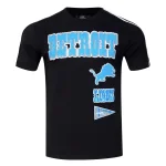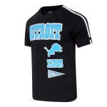 Grab thsi Detroit Lions Pro Standard Retro Classic Striped Men's Tee and show your lions pride, black with blue DETROIT, lions logo, blue LIONS and retro pennant on chest, 100% cotton made by Pro Standard