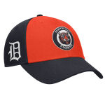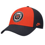 Wear this Detroit Tigers Nike Dri-Fit Club Men's Adjustable Hat to the next game, navy and orange with circle logo on front, white DETROIT TIGERS, white D logo on right side, Velcro back with 100% polyester made by Nike