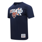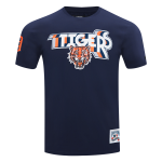 Grab this Detroit Tigers Pro Standard Retro Elevation Men's Tee for the next game, navy with white TIGERS outlined in gray orange and navy and tiger on chest, orange D logo on right sleeve, 94/6 cotton/spandex made by Pro Standard