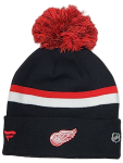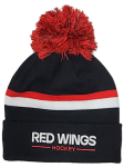Wear this Detroit Red Wings Word Rink Men's Knit Hat to the game and keep warm, black with red and white stripes, red and black pom. white RED WINGS red HOCKEY on cuff, red wings logo on back cuff, 100% acrylic