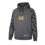 Support our military men and women and show off your team with this U of M Wolverines Colosseum OHT Aviator Men's Hoodie charcoal camo with tan stitched graphics across the front with stitched on patches on both sleeves military stripes patch on the right sleeve and USA flag patch on the left sleeve with the OTH logo made by Colosseum