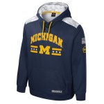 Support our military men and women and show off your team with this U of M Wolverines Colosseum OHT Cyclone Men's Hoodie navy with camo white/gray stitched graphics across the front with stitched on patches on both sleeves military stripes patch on the right sleeve and USA flag patch on the left sleeve with the OTH logo made by Colosseum