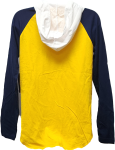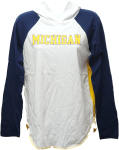 Perfect tee for gameday this U of M Wolverines GIII Knit Hooded Long Sleeve Tee all white with yellow back blue sleeves white hood with screen printed graphics 100% cotton made by GIII