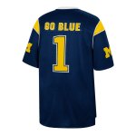 Jersey style tee with this U of M Wolverines Men's Let Things Happen Football Tee has MICHIGAN in yellow outlined in white same as the #1 underneath with yellow block M's on the sleeves has a name bar patch on the back with GO BLUE in yellow outlined in white same for the number made by Colosseum